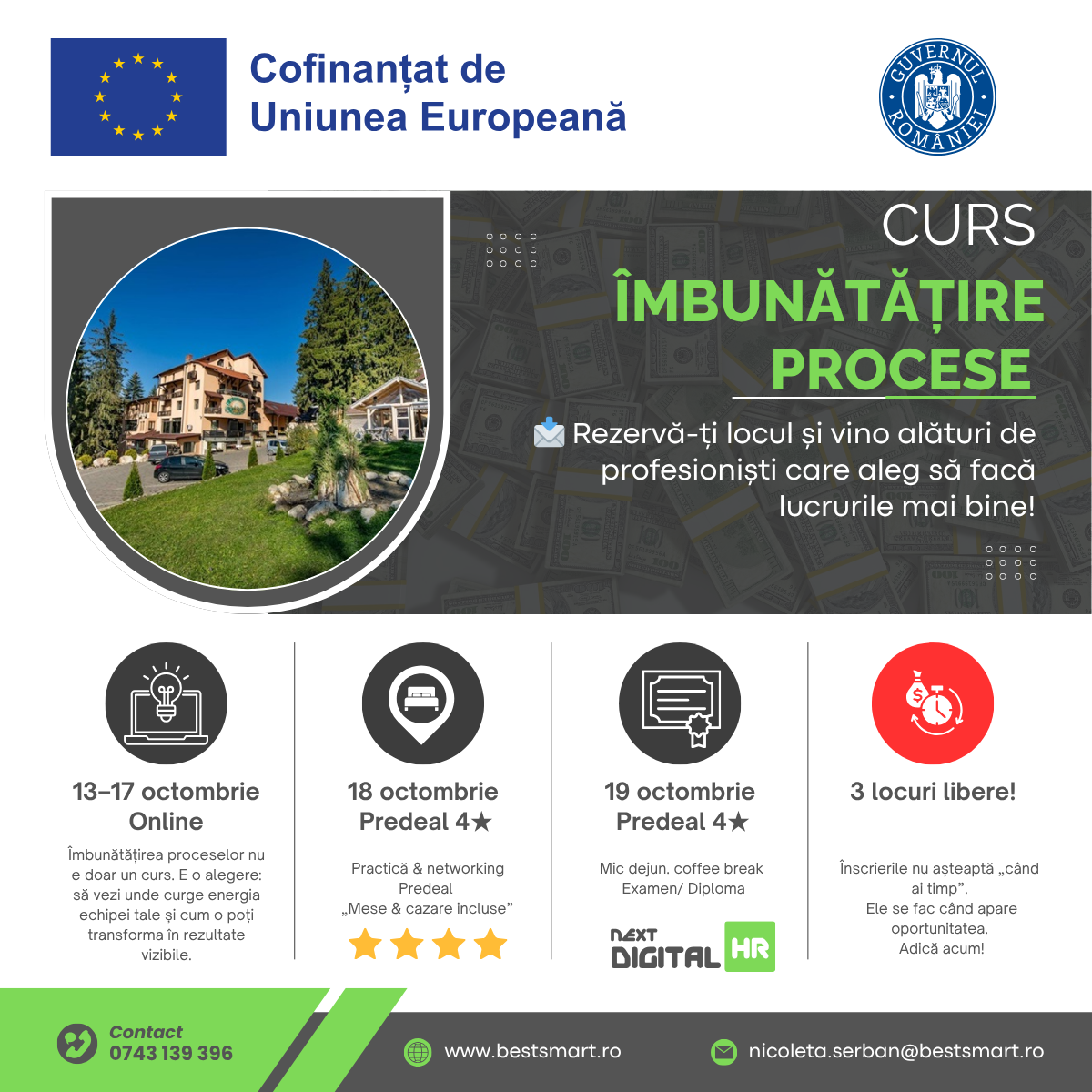 👉 Prin proiectul „Next Digital HR” oferim un curs GRATUIT de Îmbunătățire Procese, finanțat prin Fondul Social European Plus (FSE+), unde înveți pas cu pas cum să aplici aceste metodologii în activitatea ta pentru rezultate reale și măsurabile.Este o oportunitate perfectă să îți dezvolți competențele și să duci performanța echipei tale la nivelul următor — fără costuri pentru tine.