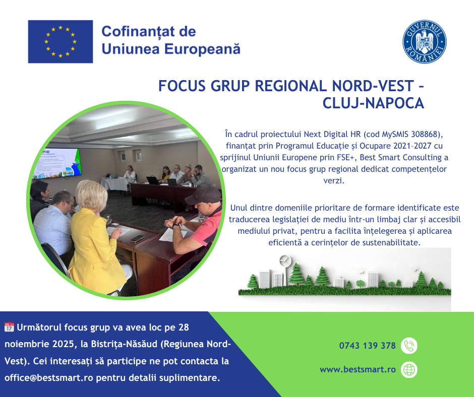 Economia verde nu este doar despre protejarea mediului. Este despre competitivitate, eficiență și responsabilitate socială. Proiectul „Next Digital HR” este cofinanțat din Fondul Social European Plus (FSE+), prin Programul Educație și Ocupare 2021–2027 și își propune, prin activitatea SA6.1, să contribuie în mod practic la tranziția către economia verde, prin identificarea competențelor necesare locurilor de muncă ale viitorului și implicarea directă a angajatorilor și profesioniștilor în procesul de definire a acestora. Ghidul rezultat din această activitate își propune să fie o resursă valoroasă pentru organizații, angajați și factori de decizie, oferind exemple practice, instrumente aplicabile și recomandări concrete pentru integrarea competențelor verzi în procesele de lucru, în formarea profesională și în strategiile de dezvoltare organizațională.