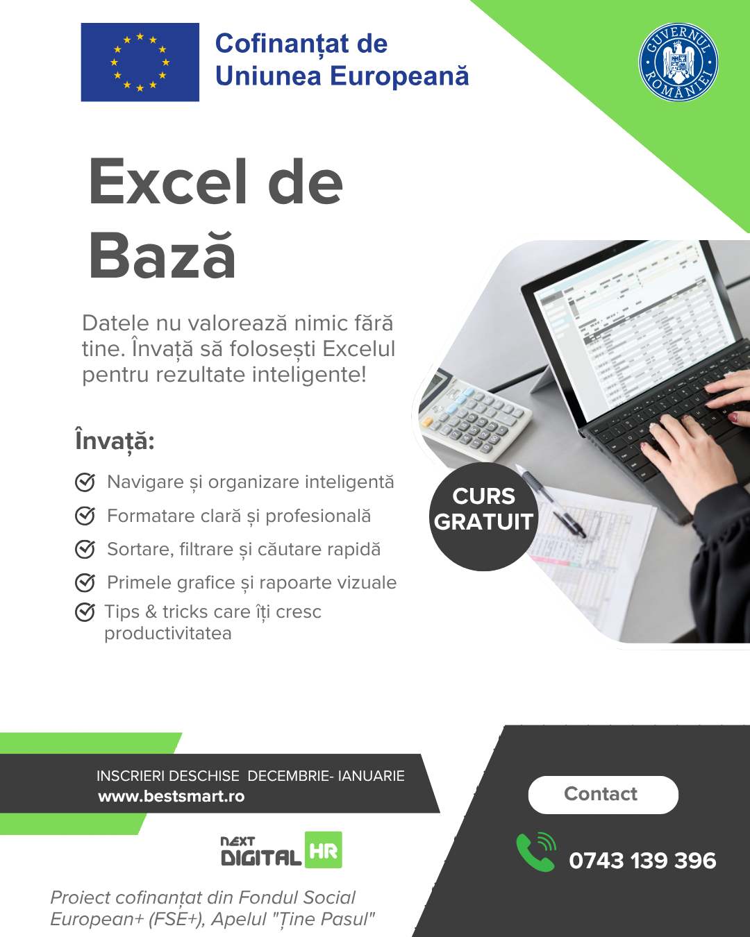 Dacă vrei să lucrezi mai inteligent, nu mai greu, iar datele să devină un avantaj pentru tine, nu o povară, acum este momentul perfect să înveți Excel de bază. Înscrie-te la cursul GRATUIT de Excel de bază din cadrul proiectului Next Digital HR și descoperă cum acest instrument îți poate transforma eficiența la job. Locurile sunt limitate și se ocupă rapid — rezervă-ți locul acum și fă primul pas către un nivel nou de productivitate!